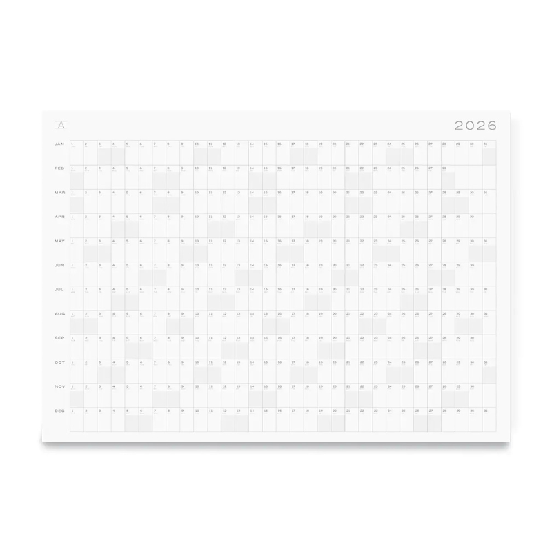 Meet the 12-month Annual Planning Calendar. Thoughtfully designed as a home base for big-picture projects, planning, and organizing, this extra-large one-page calendar allows you to tackle big goals and complex timelines at a glance. Each month runs horizontally across the page, with perfectly-sized daily boxes to capture deadlines and events. Days of the week are labeled, and weekends are shaded light gray for easy reference. Featuring smooth 100 lb stock, impactful 24” × 18” size, and fresh, minimal design that compliments any space. Whether you’re managing a product launch, coordinating summer childcare, or simply want a clear view of the year ahead, this wall calendar will keep you organized and on track.