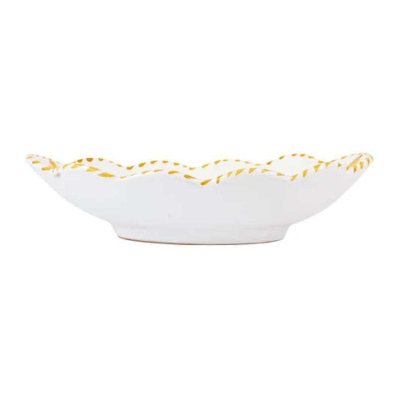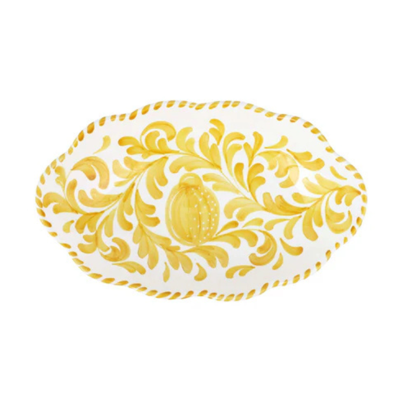 The bold patterns and rich glazes of Arezzo harken back to the centuries-old tradition of Majolica. The Arezzo Yellow Oval Bowl brings fresh life to the style's intricate designs with its organic, confident brushstrokes and is a striking entertaining piece.