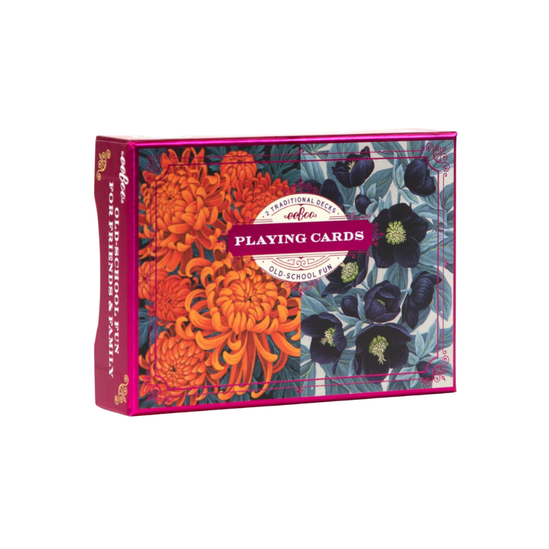 A boxed pair of classic playing cards featuring the meticulous floral artwork of Vasilisa Romanenko with colorfully gilded edges.  The face cards are traditional but just a little friendlier and more diverse.