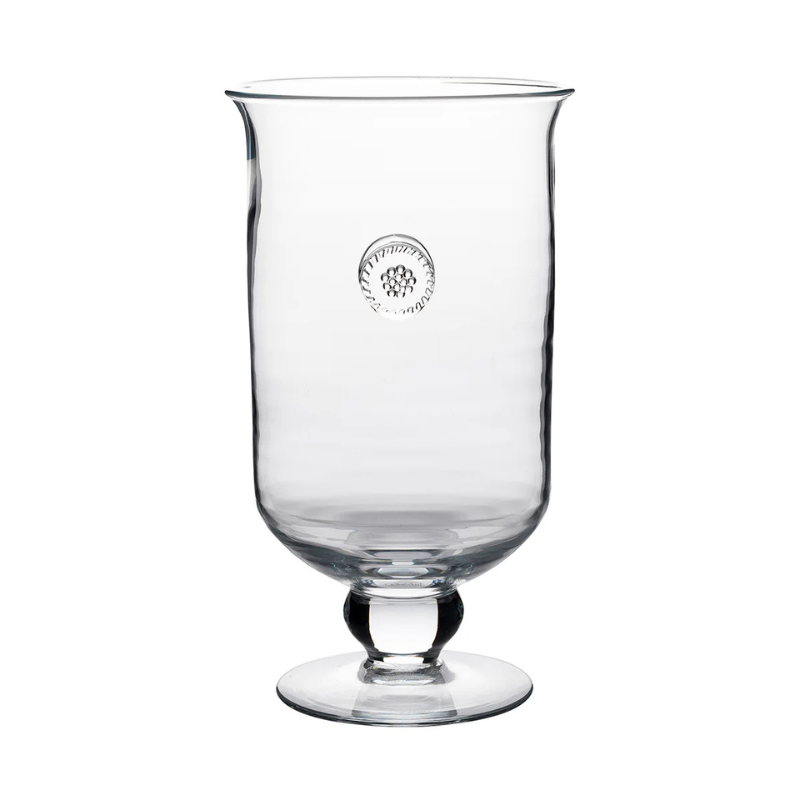 From Juliska's Berry & Thread Collection- Let dancing candlelight set the scene for a romantic night. Emblazoned with their signature medallion, this hurricane is classically styled allowing it to blend with any decor and add just the right amount of sparkle to your soiree. It can also be used as a great vase.
