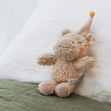 Made with a unique cotton plush fabric, Betty Hippo loves to party and wears a blush pink party hat with mustard pom pom. She loves going to the circus