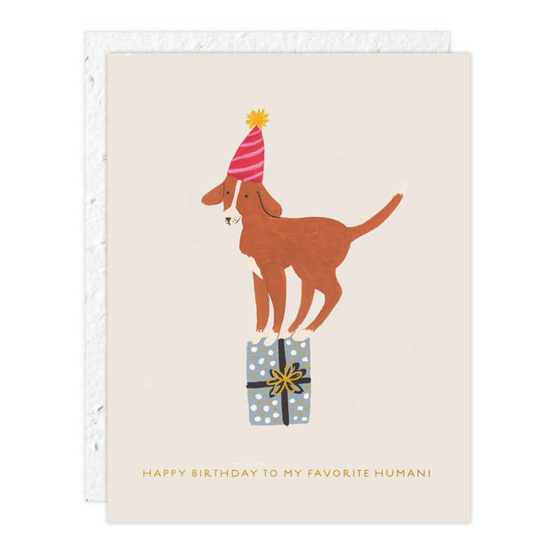 The Birthday Dog - Birthday Card has a PLANTABLE seed paper envelope which is embedded with wildflower seeds. This seed paper is made of a biodegradable eco-paper created with post-consumer materials - no trees harmed for this paper! When planted, the envelopes compost away leaving only flowers behind. Blank inside, cards are printed on premium paper and are all accented with foil details.