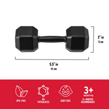 Work it, baby! Your little one's curiosity will be piqued by the gentle rattle sound and natural hand-grips, while your sense of irony will be satisfied by watching Junior do three sets of ten.