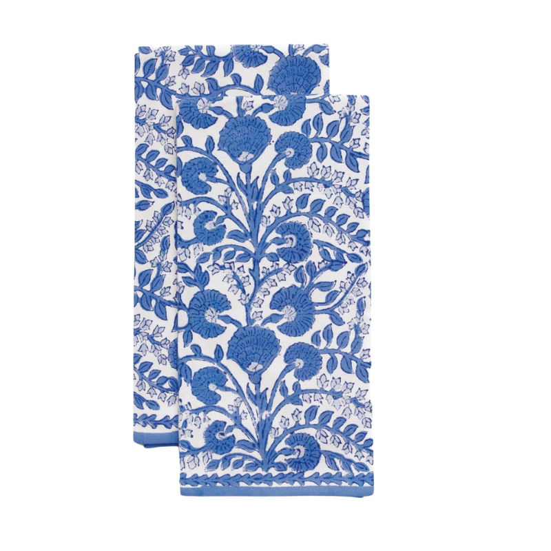 100% Cotton. Machine wash cold. Tumble Dry Low. Made in India. Each tea towel measures 20"x 26".