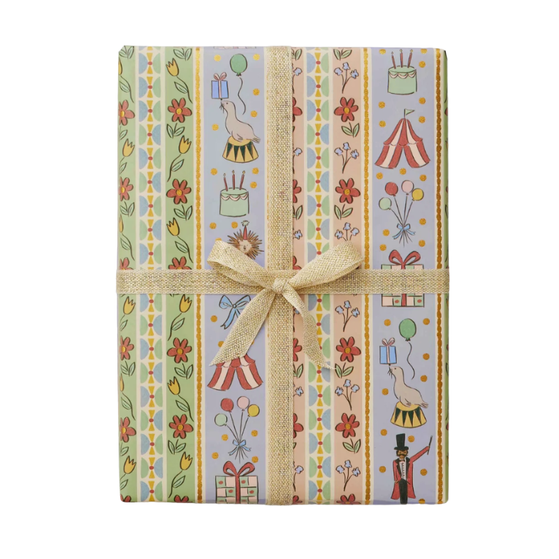 Dress up presents and projects with this wrapping roll, featuring eight feet of paper with colorful illustrations, gold foil accents, and gridlines on the back.