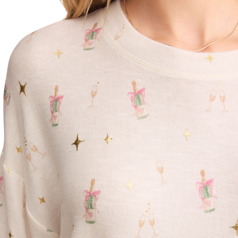 Printed with an allover champagne toast motif, this soft slub knit top blends fun and function. Relaxed and comfy, it’s made for sleep-ins, couch hangs, and slow holiday mornings.