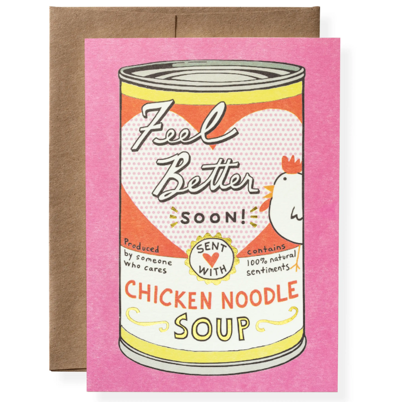This Chicken Soup greeting card is printed and foiled in Memphis, TN. Full color ink printed on natural white paper, letterpress printed in gold foil, and paired with a kraft envelope. Book folded card, blank on the inside.