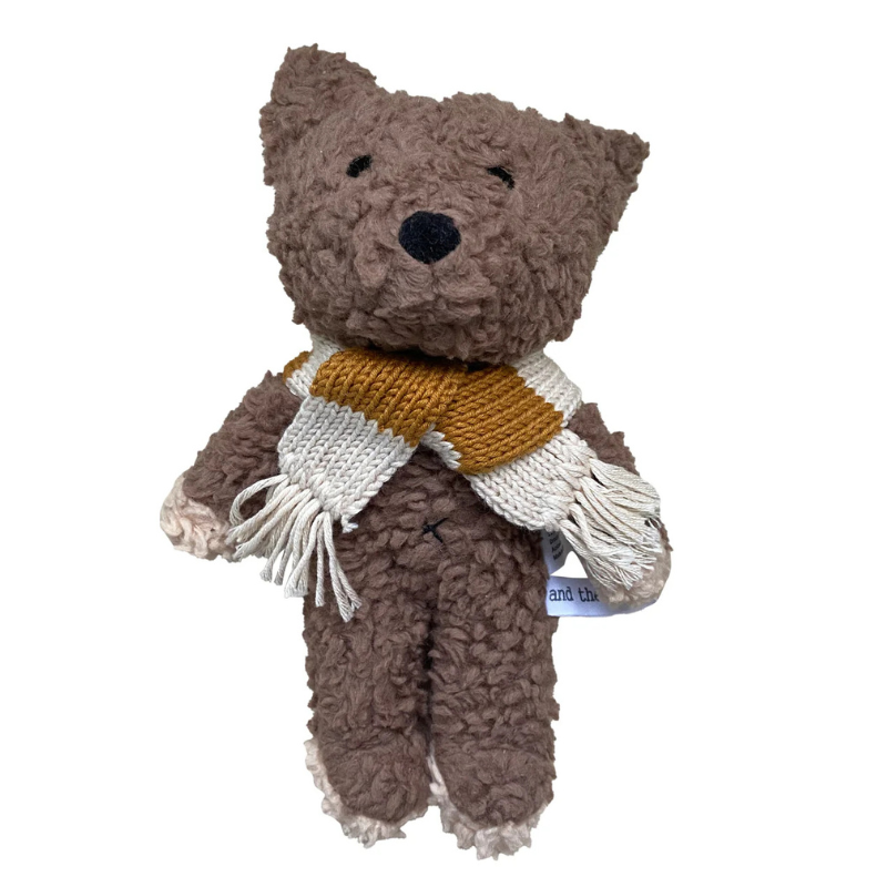 Elliot dog is made with a unique cotton plush fabric and sports a striped knitted Australian merino wool striped scarf. He loves hunting for treasure, toasting marshmallows and  exploring in the woods.
