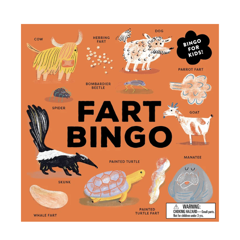 Be the first to fill your bingo card with animals and their farts of all different shapes, sizes and colors. With hilarious illustrations, fascinating farty facts, and quick to learn rules, Fart Bingo will have you giggling and guffawing in no time.