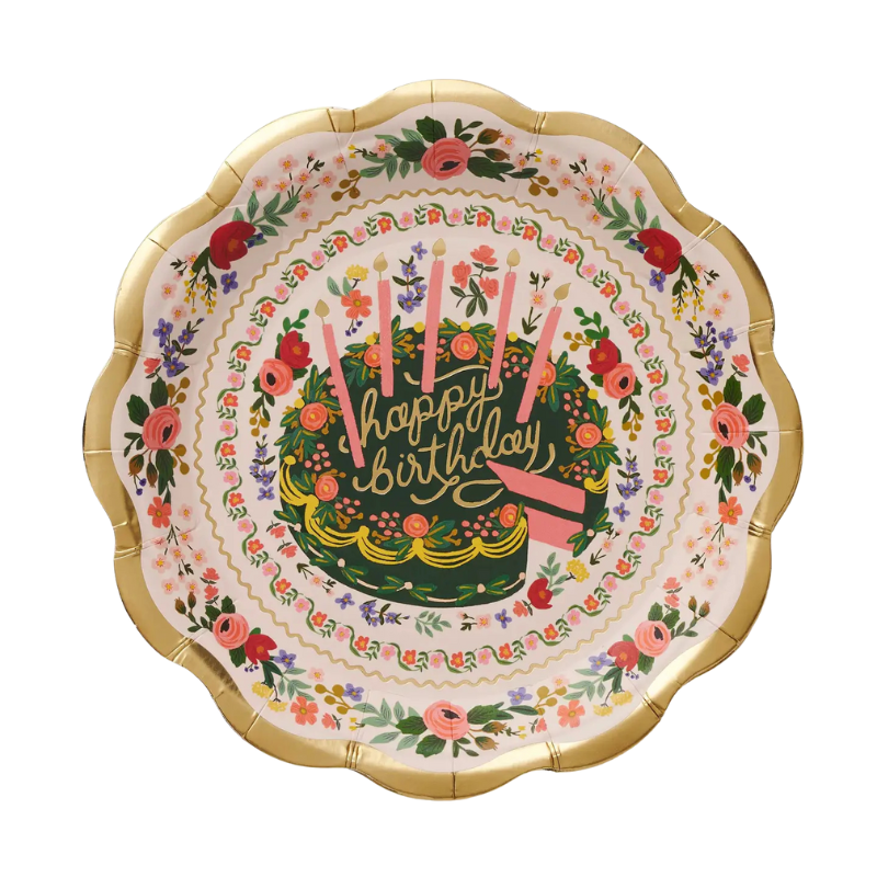 With a floral border and an illustrated birthday cake, this set of 10 small paper plates is perfect for serving cake or party snacks at your next celebration.