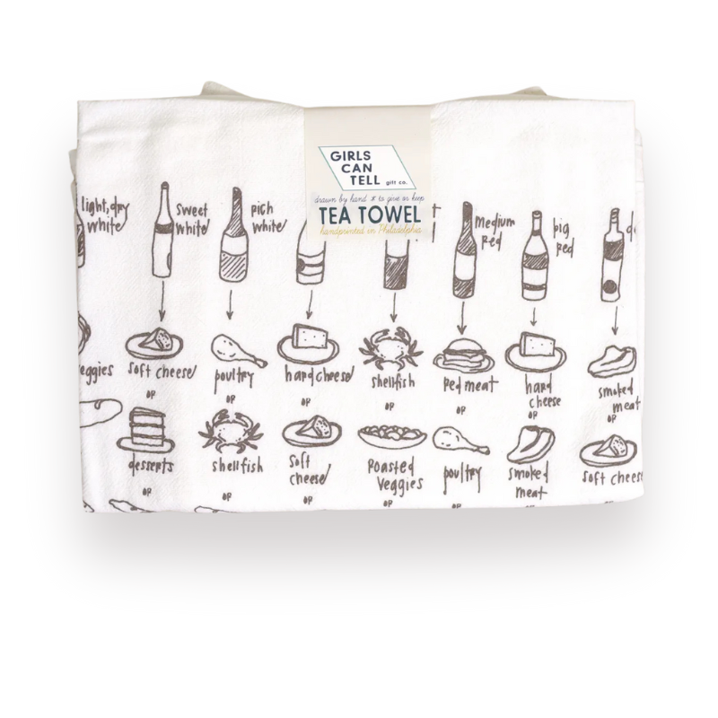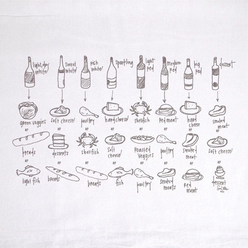 Each varietal of wine, labeled with its perfect pairings, and drawn + screen printed onto washable lint-free floursack cotton kitchen towels.
