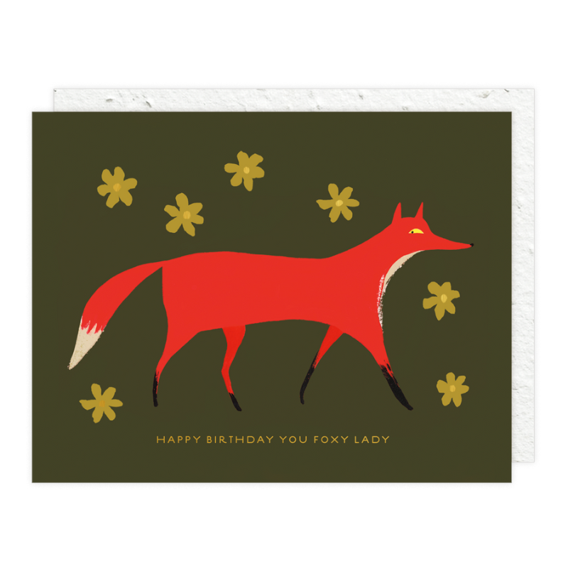 The Foxy Birthday Card has a PLANTABLE seed paper envelope which is embedded with wildflower seeds. This seed paper is made of a biodegradable eco-paper created with post-consumer materials - no trees harmed for this paper! When planted, the envelopes compost away leaving only flowers behind. Blank inside, cards are printed on premium paper and are all accented with foil details.