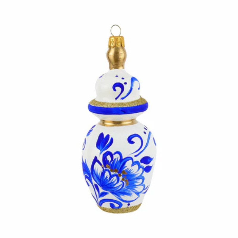 Uniquely shaped like a ginger jar and adorned with delicate handpainted blue and white designs, the Figural Ginger Jar with Large Flowers Ornament evokes a sense of elegance and tradition. The serene blue and white hues evoke a sense of elegance and tradition, making them the perfect addition to your tree.