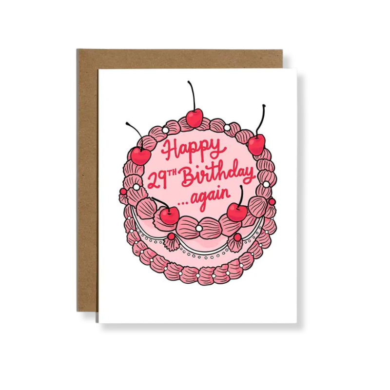 Happy 29th Birthday...again! The cutest card for your bestie turning 30 this year because we never really leave our twenties. Illustration is of a vintage birthday cake with red maraschino cherries and piping.