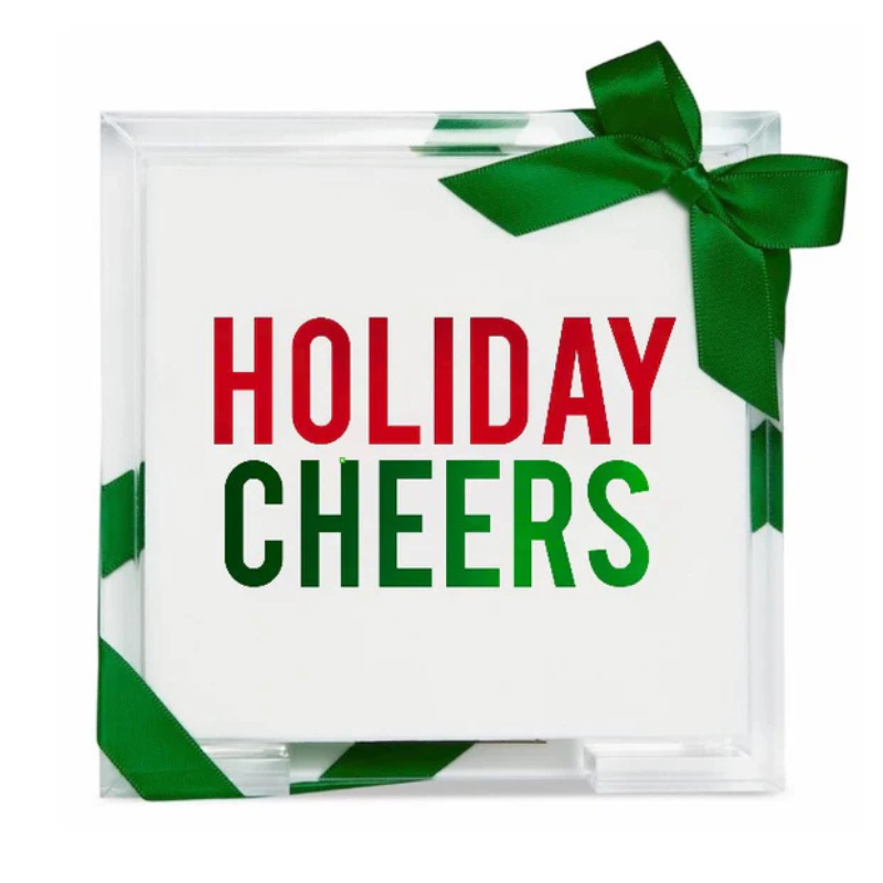 These heavy-weight acrylic trays are both beautiful and functional with a unique cut-out on one side.  Each tray contains 24 cloth-like disposable napkins with a foil embossed message that has a rich, letter-press effect that is several cuts above your average paper cocktail napkin.