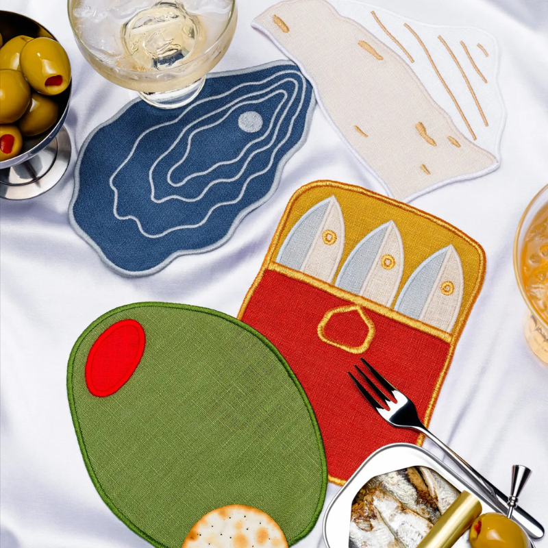 Happy hour just got happier with these 100% linen cocktail napkins: an olive, a sardine tin, an oyster and a wedge of stinky, delicious cheese.