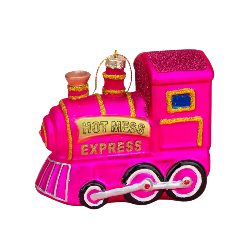 The Hot Mess Express Locomotive Ornament is pulling into the station — glitter-fueled, chaos-approved, and right on brand for anyone barely holding it together. Hand-blown in electric pink with gold glitter details, it’s proof that trainwrecks can still sparkle.