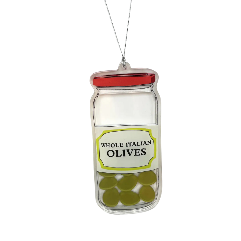 Jar of Olives Shaker Christmas Ornament Approx 4", double-sided, comes with sparkly silver string to hang on.