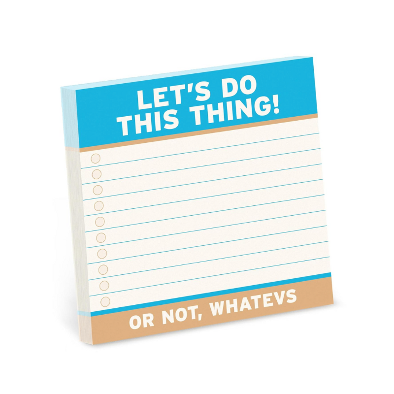 Knock Knock Sticky Notes are perennial favorites at home, work & school, beloved, for their distinctively witty voice and functionality. And this 4x4-inch title offers more room for writing (and for amusing editorial content). “Let’s Do This” offers can-do enthusiasm with a dash of apathy—with plenty of space for longer memos or lists!