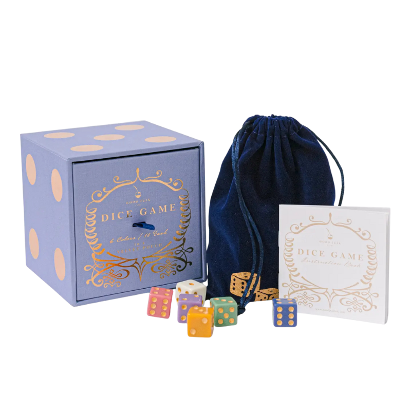 Set features a velveteen foil stamped bag to hold dice and a velveteen lined, die-shaped box that doubles as a dice up.