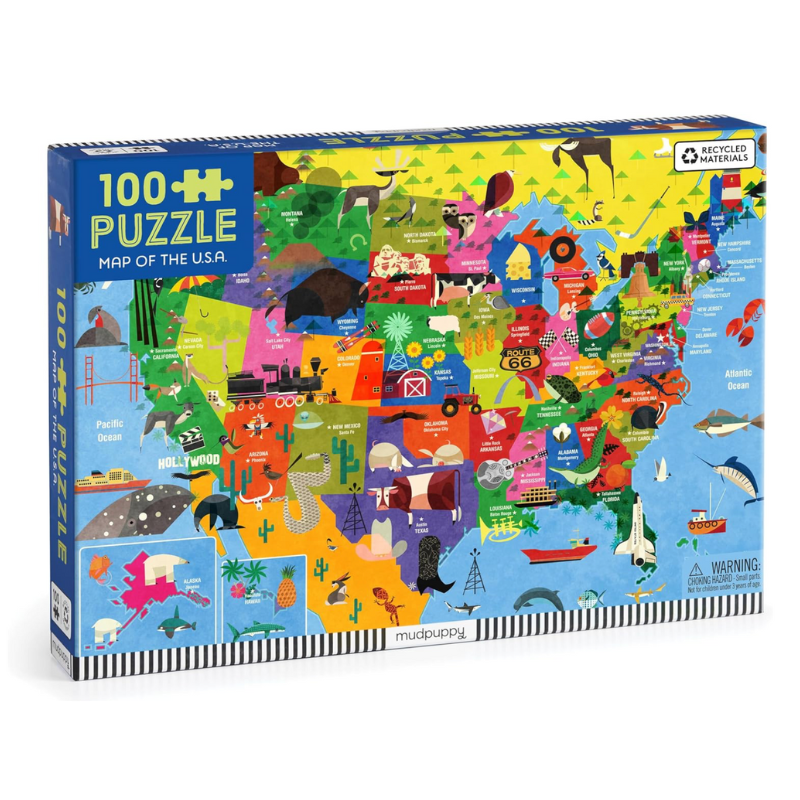 Our 100 piece Map Of The USA jigsaw puzzle features an engaging image of all the United States as well as historical landmarks and cultural icons . The puzzle is a great activity for kids to do alone or for families to join in and solve the puzzle together, all while creating a positive bonding experience for young ones. The box shows the completed puzzle artwork and is an ideal place to keep pieces safe and free from damage.