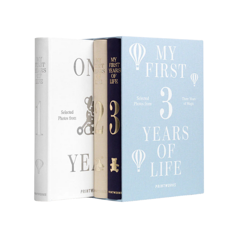 Celebrate the magic of your child’s first years with this beautifully designed photo album set. Housed in an elegant slipcase, the bundle includes three separate albums — one for each of your baby’s first three years, perfectly capturing every precious milestone. With its book-like format, it fits seamlessly into your bookshelf while keeping treasured memories thoughtfully organized and close at hand.
