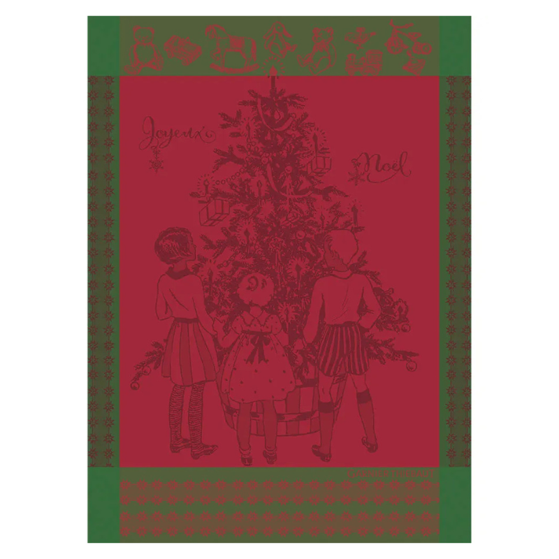 The Noel D'Enfance Houx Jacquard Kitchen Towel captures the spirit of the season with a festive scene of children around a Christmas tree in red and green hues. Its cotton texture brings warmth and joy to holiday kitchens.