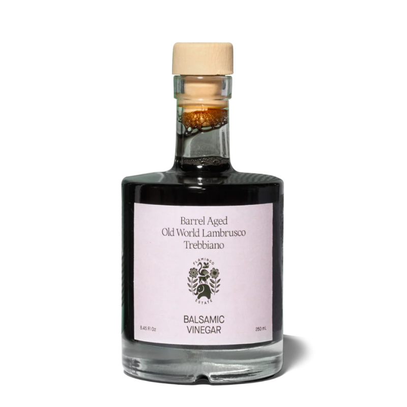 Flamingo Estate fell in love with this special Balsamic for its rich, silky texture and deep, sweet flavor profile. It's the sort of flavor you can only get from aged Balsamic, made in oak barrels over long Winters. The Trebbiano and Lambrusco grapes are grown and hand-selected by Balsamic maker Nicolo Verrini. His passion for Balsamic was passed down by his grandfather, who started making Balsamic Vinegar back in the 60's. Nicolo is a firm believer that the best Balsamic begins with the best grapes, and his goal is to preserve the beauty that Mother Nature provides. Use it on EVERYTHING — cheese, salads, or even on a spoon in the middle of the night when nobody is watching!