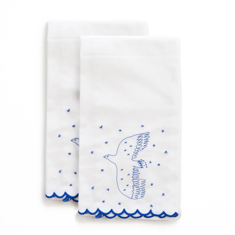 Add a touch of peace and whimsy to your kitchen with these charming Embroidered Peace Dove Tea Towels. Featuring a blue Christmas dove and delicate scalloped edges, these towels will bring joy to your everyday tasks. Spread peace and holiday cheer with every use.