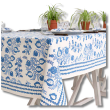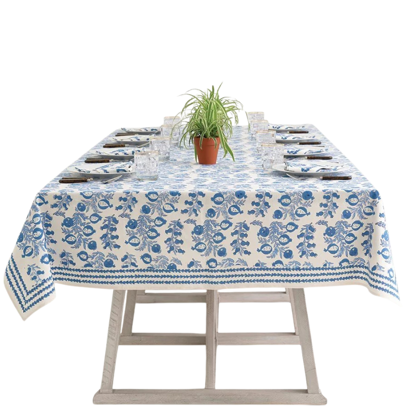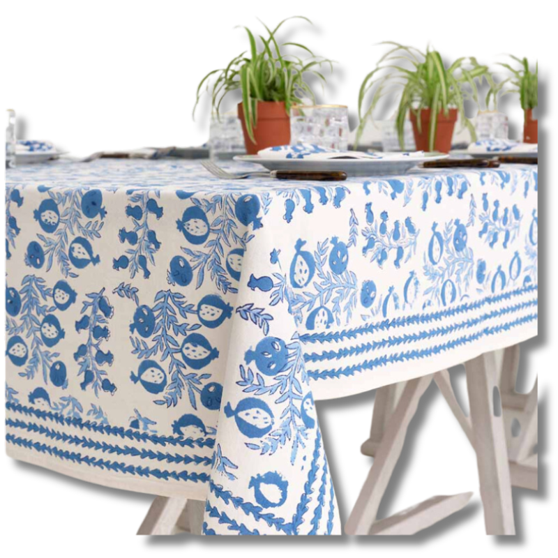 The sweet shape of young pomegranates inspired this print. Lively branches with pale blue leaves end with plump pomegranates in more shades of blue.