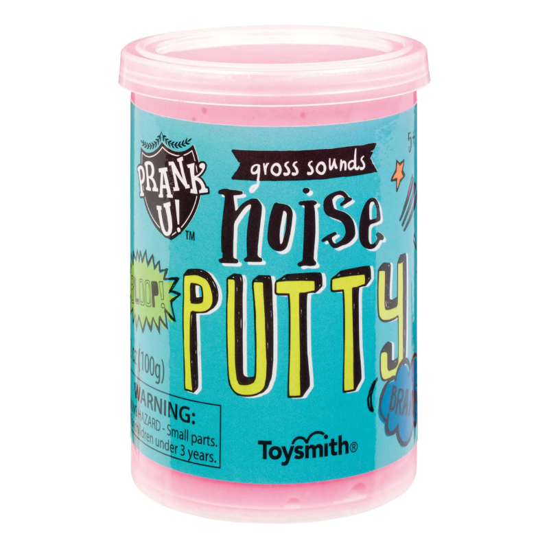 Noise Putty makes a cacophony of crude, funny sounds when prodded, poked, squished or squeezed. Available in 5 assorted colors including yellow, pink, green, blue, or orange. Each prank putty fits neatly inside a resealable plastic container. An assortment of 12 fit neatly in a yellow and teal display box.
