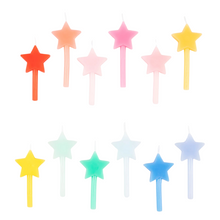 • Set of 12 wax star candles in shades of pink, yellow, blue and green