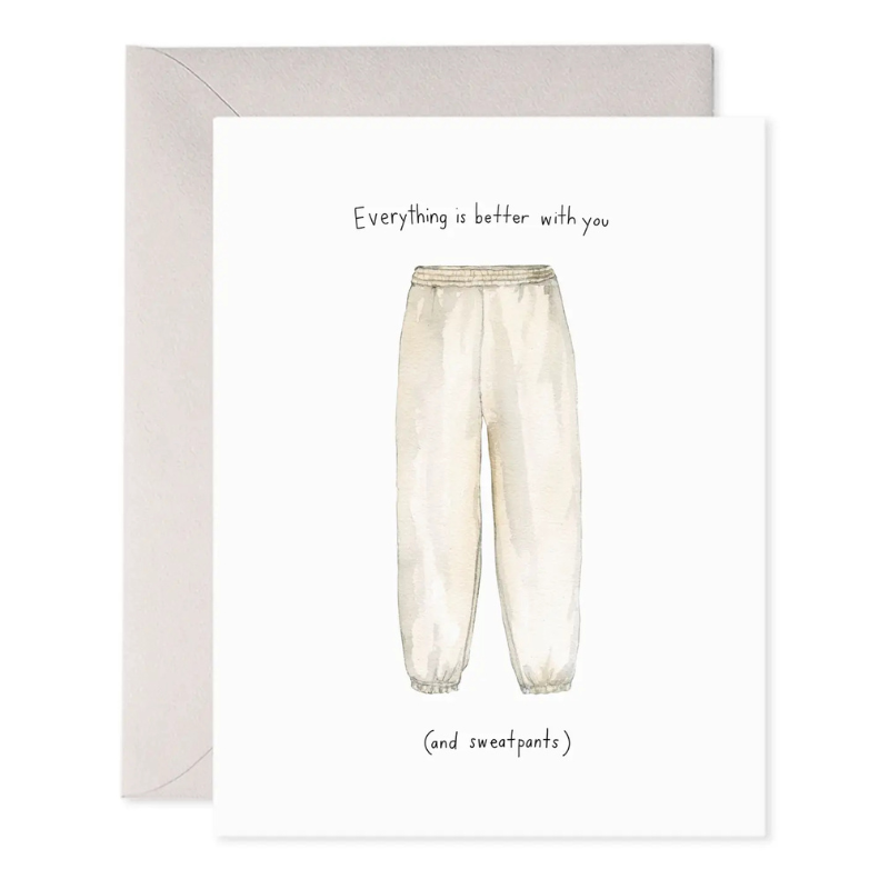 Celebrate cozy love with the Everything Is Better With You (and Sweatpants) Sweatpant Love card—perfect for love, friendship, and those who cherish comfy moments together. This charming card is ideal for anniversaries, just because, or any time you want to say “I love you” with a fun, relaxed vibe. Perfect for couples, best friends, and cozy connections!