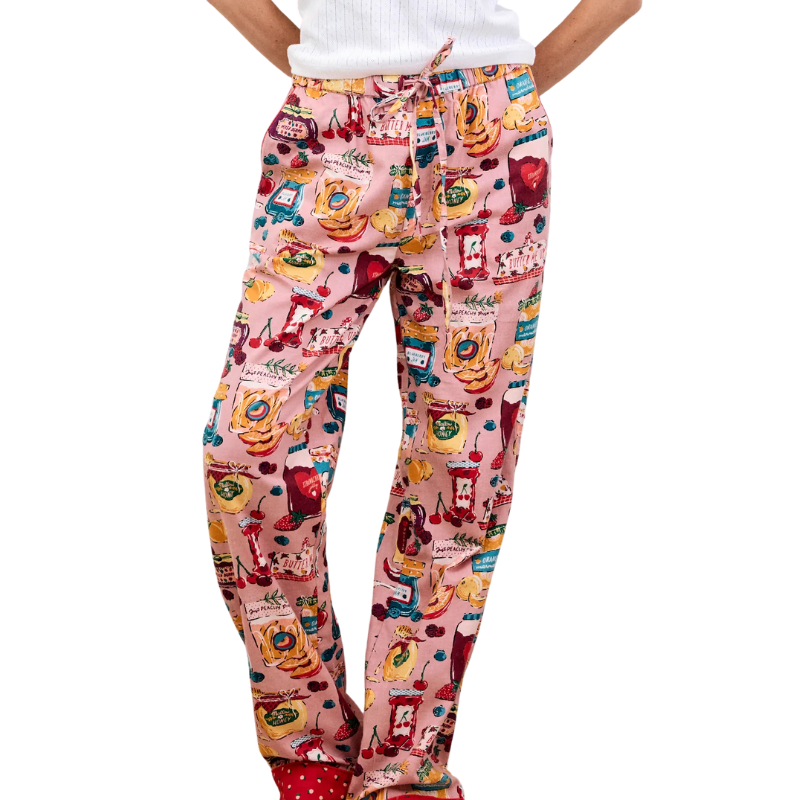 Preserve your sweetest dreams in these jam-themed sleepwear pants in a blissful berry hue. Hand-screen-printed fruits and vintage jam jars celebrate slow living on breathable, lightweight pajamas perfect for cozy autumn nights. These fall lounge pants feature an easy mid-rise fit with pockets and adjustable drawstring comfort.