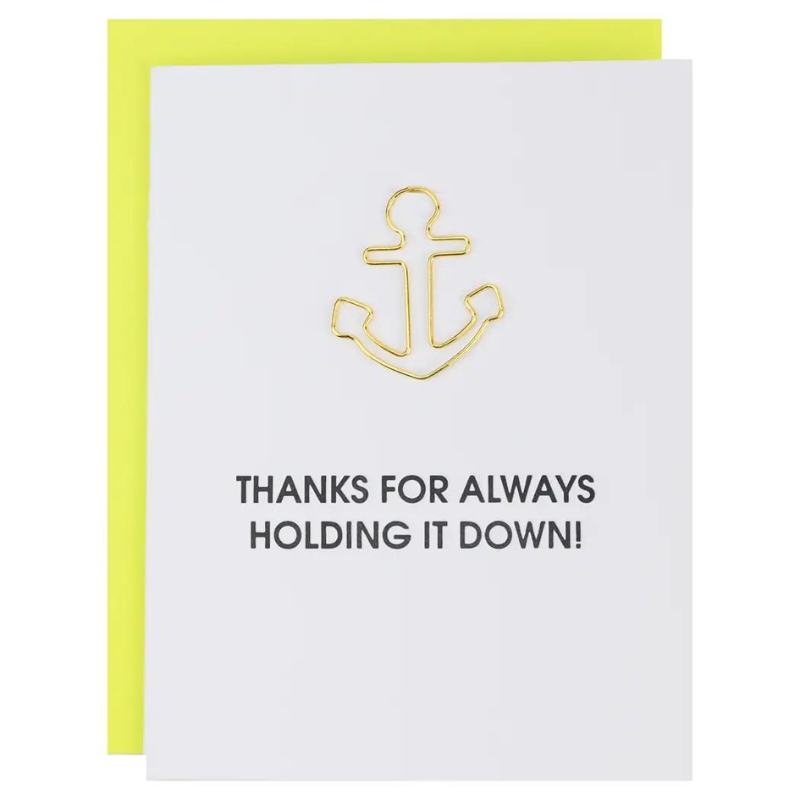 "Thanks For Always Holding It Down" card is letterpress printed on a vintage printing press in sunny California. Card includes a heavy duty anchor paper clip.