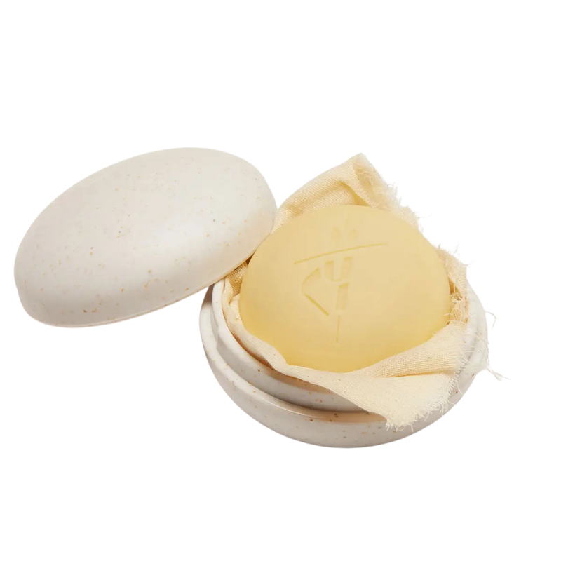 A minimalist travel case bespoke to the full-size and mini Body Stone lotion bars. Subtly speckled, this biodegradable biocomposite is made of bamboo and plant starches—and is as reusable as our signature bamboo canister.