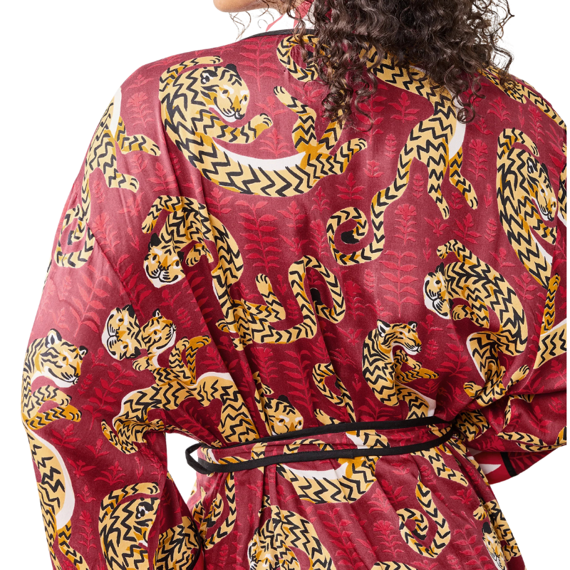 Unleash your wild side with the Twisted Tiger satin robe in rich Merlot. This tiger print robe features silky Eco Satin, deep pockets, and luxurious length. Perfect holiday gift for fierce friends. This satin robe with pockets transforms morning coffee into pure luxury. A lavish satin sleep robe that doubles as your favorite lounge robe.