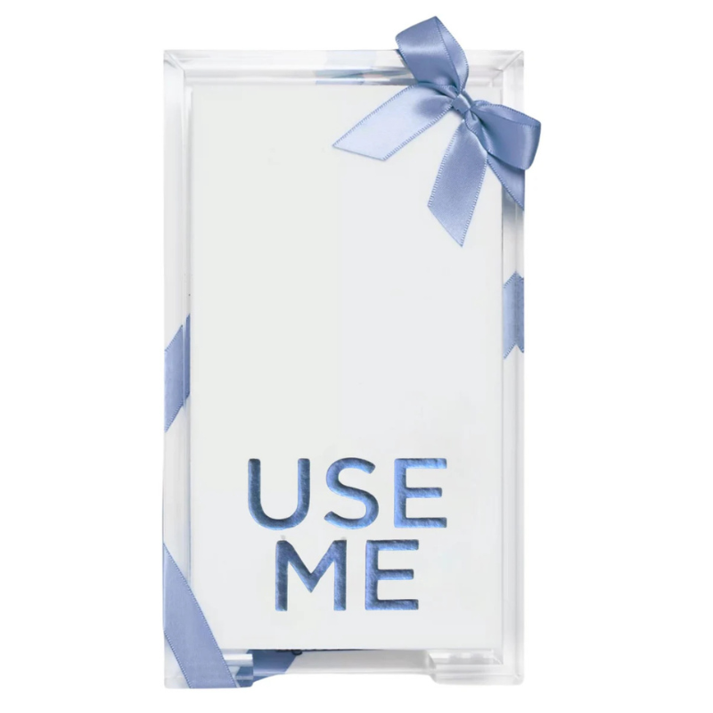 These heavy-weight acrylic trays are both beautiful and functional with a unique cut-out on one side. Each tray contains 20 cloth-like disposable guest towels with a foil embossed message that is several cuts above your average paper hand towel.