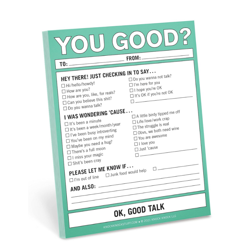 Sometimes, the most supportive thing you can say to another person is simply, "You good?" It's lighthearted yet sincere, never heavy or nosy— just right for reaching out to friends, neighbors, family, coworkers, baristas, delivery people, or ... well, anyone!